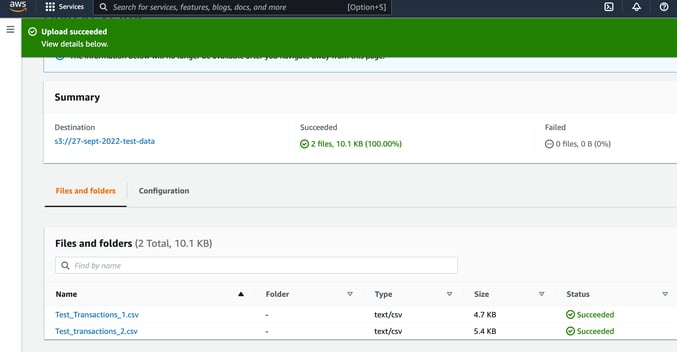 The we will upload a couple of CSV files containing transaction information into a bucket called “27-sept-2022-test-data”