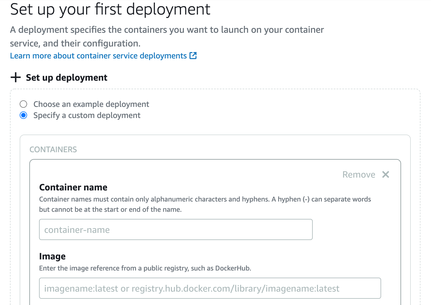 You can now specify the container name and image location of the container you wish to deploy within the Lightsail container instance.